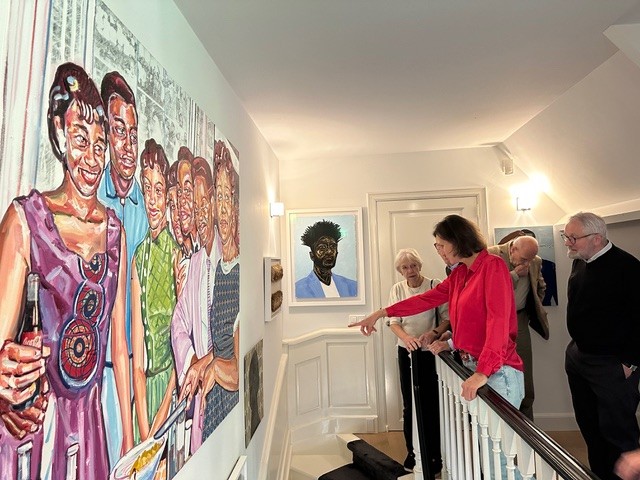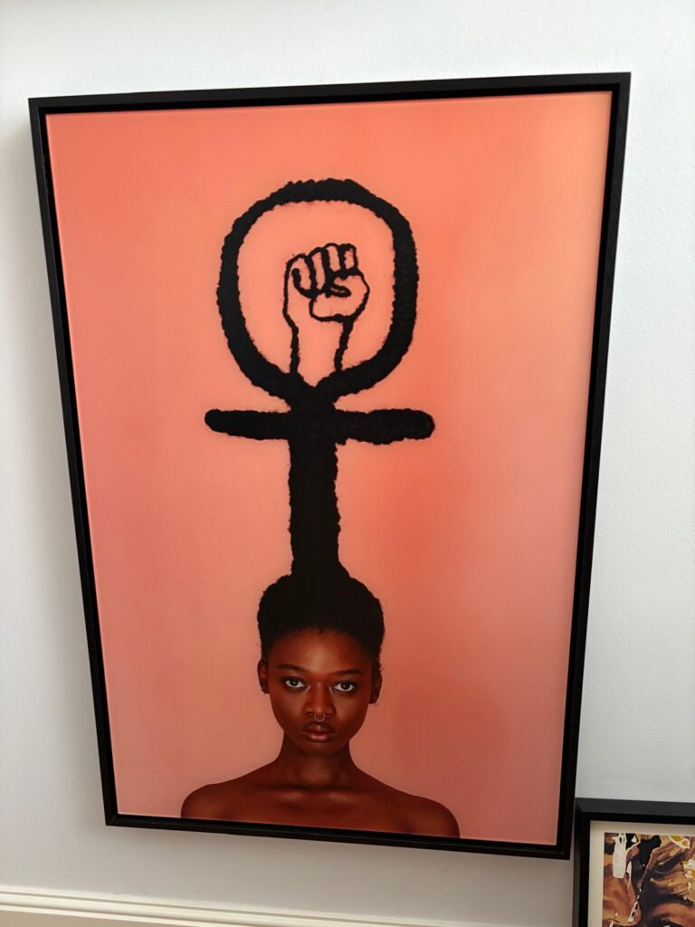 Geen plek langs de trap bleef onbenut om al het moois op te hangen. Hier een werk van Esiri Essi “Luster’s pink original”.