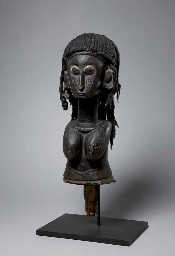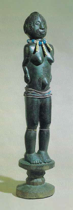 Het hiernaast getoonde beeld heeft wellicht een andere plaats dan buitenhuis gehad. Daarvoor spreken de fijn uitgewerkte details, de vrij realistische weergave, het patina en de kettingen samengesteld uit glaskralen en ivoor. Staand op een kruk verwijst dit vrouwenfiguur naar de prominente plaats binnen