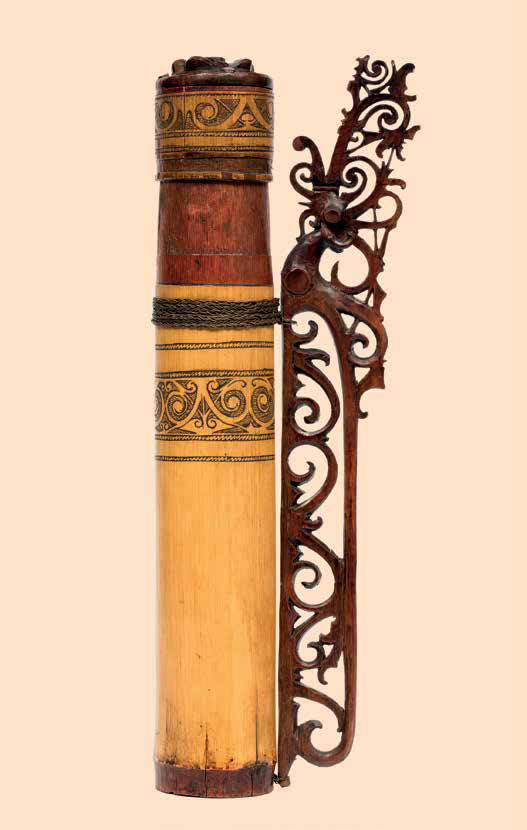ook de onderkant van de doos rijkelijk kan zijn versierd, zoals ook hier met antropomorfe figuren. Kunstenaars kunnen zich uitleven in de toepassing van bestaande volkseigen motieven en hebben de vrijheid die binnen bepaalde grenzen op een persoonlijke wijze uit te werken. Het getoonde exemplaar meet 51 cm. en gelet op de details is deze nog op traditionele wijze vervaardigd.