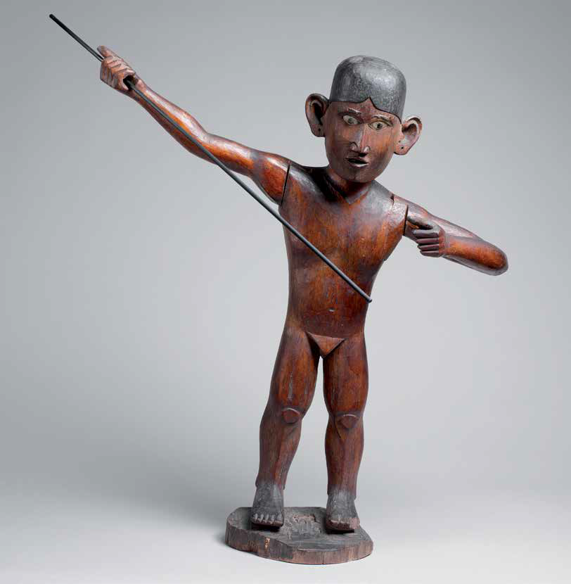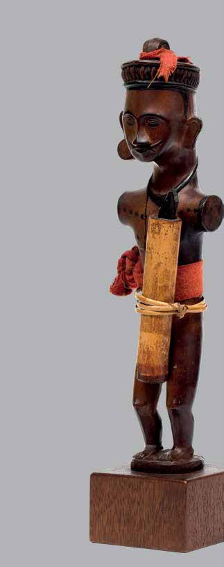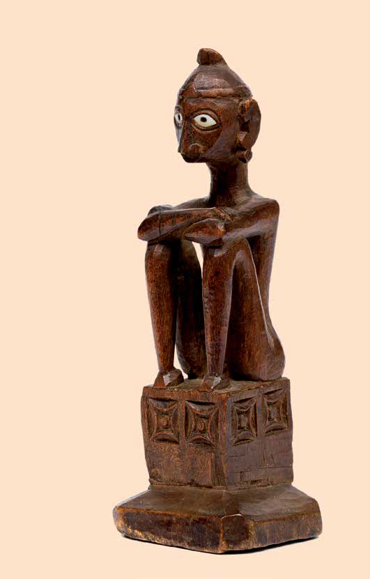 effectiviteit. In dit geval zijn de met schelp ingelegde grote ogen en de uitgestoken rechterarm, waar oorspronkelijk een mes of speer in was gestoken, de meest in het oog vallende eigenschappen. Enkele beelden die aan het einde van de negentiende eeuw in Europese openbare collecties terecht zijn gekomen, zijn qua uitbeelding en haarstijl vergelijkbaar met het huidige exemplaar waaruit we mogen concluderen dat ook dit beeld uit die tijd moet stammen. H. 80 cm.