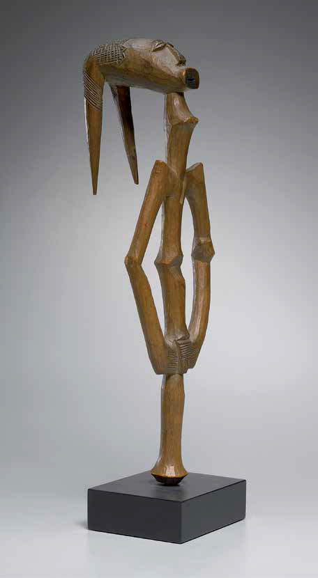 Eén van de hoogtepunten uit de collectie is zondermeer het Chokwebeeld van een hoofdman. Van dit type beeld zijn er tot nu toe ongeveer 12 geregistreerd. Het stelt een hoofdman voor, een mwanagana, heer van het land. Hij is hier traditioneel uitgebeeld als jager, die oorspronkelijk in zijn handen een wapen gedragen heeft en waarvan een restant van de draagriem nog om zijn hals aanwezig is. Naar voorbeeld van Chibinda Ilunga, de mythische Luba-prins die als grootwildjager eropuit trok en tijdens zijn omzwervingen de Lunda-prinses Lweji ontmoette en trouwde, waarna hij door zijn schoonvader de macht kreeg overgedragen. Hij is immer aan de hoofdmantooi te herkennen en niet zelden met jagersattributen uitgebeeld zoals in dit beeld naar voren komt in het (nu afwezige) wapen en een jagerstas die op zijn rug te zien is en een gordel. Bastin (1978) is van mening dat naast acht oudere beelden die zij dateert rond het midden van de 19e eeuw en die de mythische jager voorstellen, dit beeld tot een groep behoort die later in de 19e eeuw is vervaardigd, en niet de held maar een hoofdman voorstelt. Opmerkelijk zijn de voeten en handen die behalve groot slechts vier vingers en vier tenen aan elke hand en voet telt. Mogelijk is dit een verwijzing naar de bijzondere status, immers de hoofdman-koning staat als mwanagana voor het welzijn en de vruchtbaarheid van de samenleving. H.47 cm. Uit: Christie’s London catalogus, ‘The Meulendijk Collection of Tribal Art’, Part 1, 21 oktober 1980