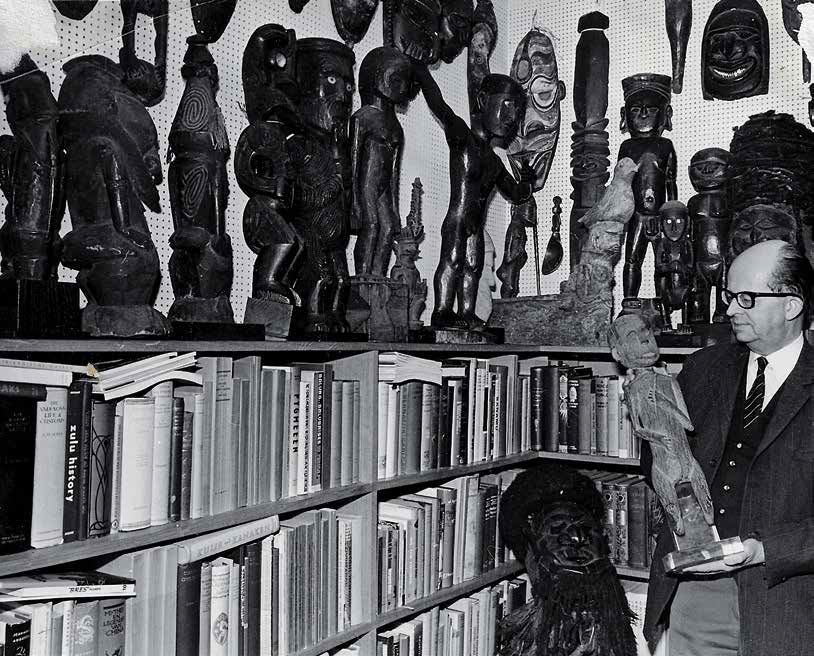 zijn bezit. Enkele foto’s die genomen zijn bij gelegenheid van de tentoonstelling van Afrikaanse kunst – waarvan er een opgenomen werd in Rotterdamsch Nieuwsblad – laten hem zien als een heer met vest te midden van zijn niet uitgeleende verzameling Oceanië. Kijken we langs de vele beelden op de boekenkast en de maskers aan de muur, dan valt een ontegenzeggelijk gevoel voor kwaliteit op: Sepik, Maori, Kanak en een zeldzaam beeld uit de Nicobaren die niet standaard in de Nederlandse handel te vinden zijn. Begin jaren 1960 ontmoet Meulendijk de jonge Loed van Bussel, een gedreven handelaar en verzamelaar die zijn negotie in Den Haag heeft. Van Bussel komt regelmatig in het buitenland en is kind aan huis in verscheidene Duitse volkenkundige musea. De taal vormt voor hem geen drempel, want zijn moeder is Duitse. Die Duitse achtergrond komt hem van pas in zijn zucht oude collecties op te sporen die gerelateerd zijn aan koloniale expedities in het Stille Zuidzeegebied. Vanwege zijn reislustigheid en de honkvastheid van Meulendijk wordt Van Bussel de ‘buitenman’.