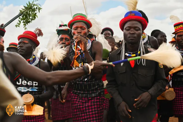 O tempora, o mores : intussen is de traditie van de afneembare “ etimat “ ver weg en dragen de Karamojong bij ceremonies … een flashy hoge kleurrijke vilten of strooien hoed. (Afbeelding 20)