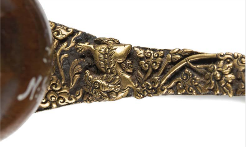 De kopse kant van de klingbasis naast de greep met een leeuwtje tussen gemonteerde gouden florale motieven, een teken van status en rijkdom.