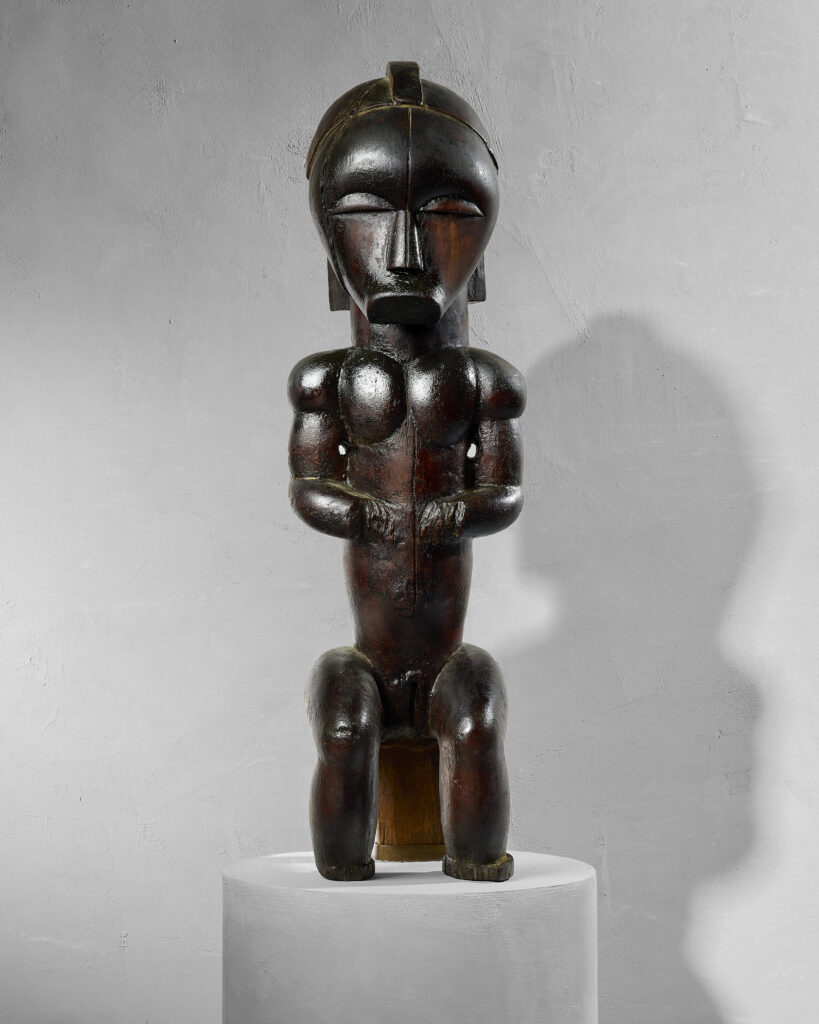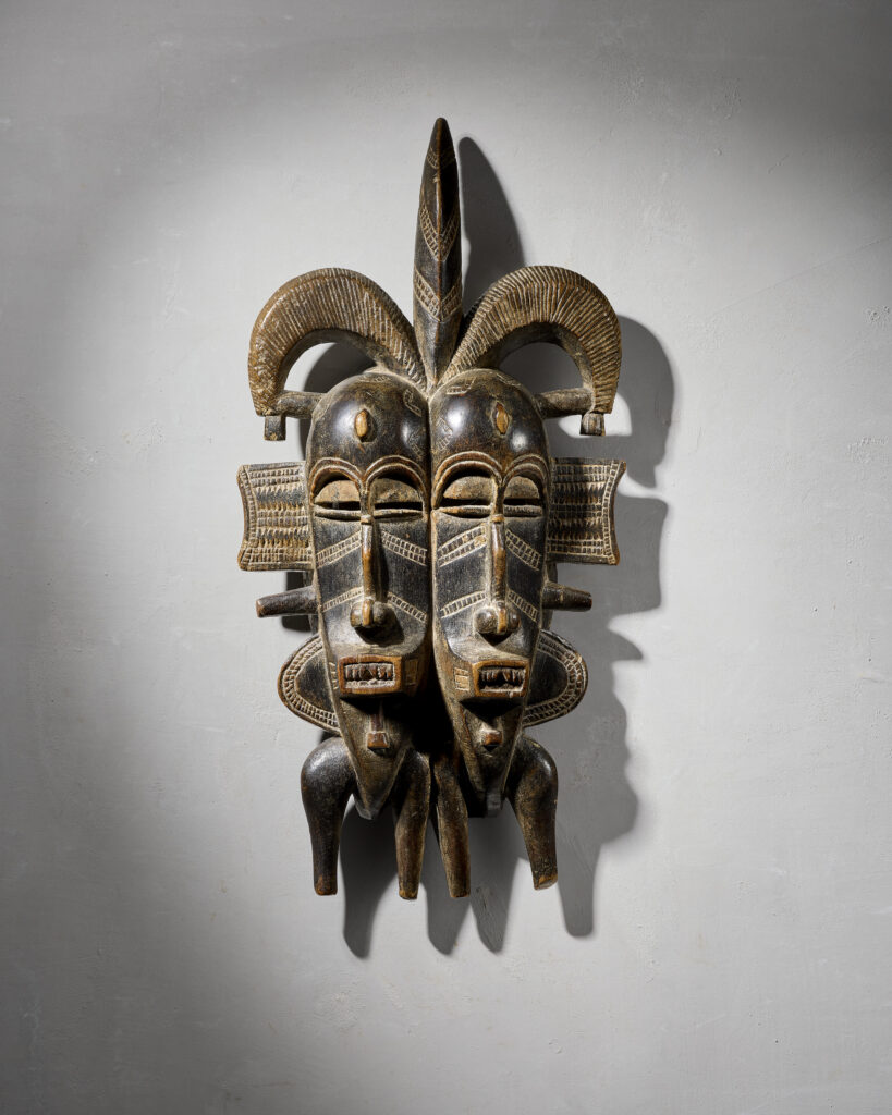 Een van de hoogtepunten van de veiling is een opmerkelijke verzameling maskers, waaronder een drie gezichts Ligbi-masker (links), een dubbel Senufo-masker (rechts) en een zeldzaam naturalistisch Songye-masker (hieronder rechts). Daarnaast neemt figuratieve beeldhouwkunst een centrale plaats in, met meesterwerken zoals een superieure heddle-pulley van de Master of Bouafle (hieronder links)) een krachtige Fang-reliëfwachter (helemaal beneden, links) en een fraaie kleine Songye (helemaal beneden rechts).