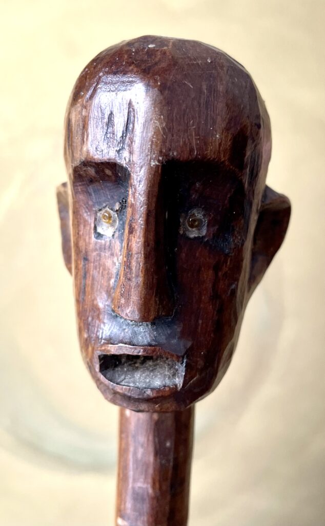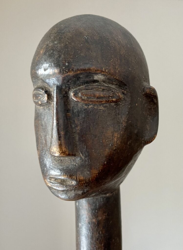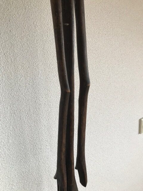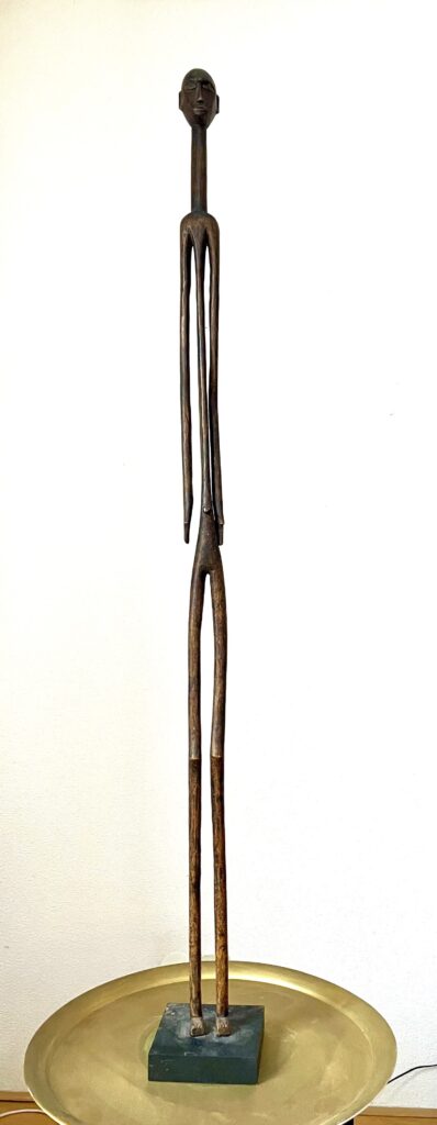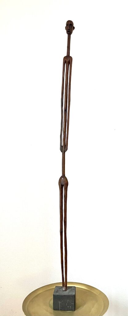 Vorig jaar kocht ik bij veilinghuis Zadelhoff voor 25 euro twee houten sculpturen van Afrikaanse mannen (één arm defect). Ik had door tijdgebrek geboden zonder te gaan kijken. Het was duidelijk geen paartje en de ontbrekende arm maakte het veilinglot minder aantrekkelijk. Maar de associatie met beelden van Alberto Giacometti deden mij er toch op bieden. En ja, ze werden aan mij toegeslagen. Toen ik ze ging ophalen werd ik erg enthousiast. Beide figuren hadden een prachtig maar verschillend patine en de hoofden waren ook erg verschillend. (zie foto’s hieronder).
