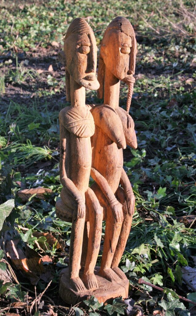 Het duidelijkst nog zijn de beelden van man en vrouw, de koppels. Het zijn de vrijgezellen die zo’n beeld laten snijden, mannen die geen vrouw hebben en daardoor heftig lijden – een Afrikaanse uitdrukking! Op zo’n beeld legt de man zijn hand over de schouder van de vrouw, als teken van toenadering en binding. Dit zijn dus geen zg. primordiale koppels, die uitdrukking zegt de Dogon niets.
