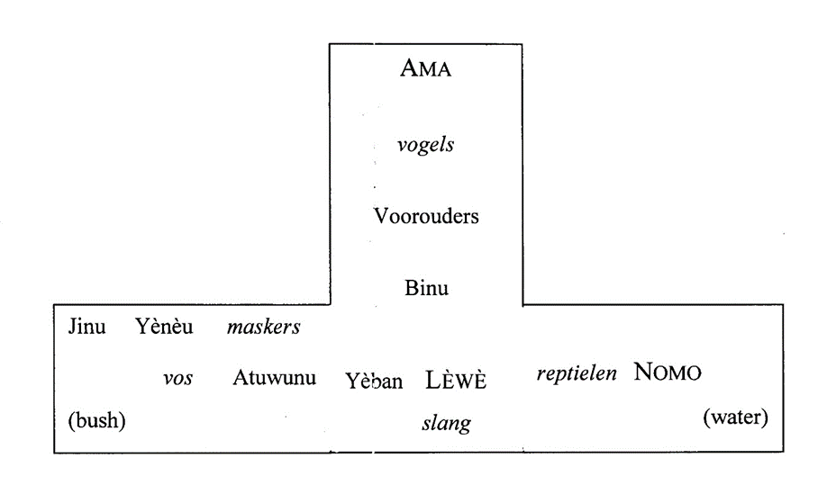 De horizontale as contrasteert het dorp met bush (links) en water (rechts). Alles buiten het dorp is bush, woonplaats van diverse geesten. Als aarde-god regeert Lèwè ook over de bush, waar de vos, het waarzeggende dier, bij hem hoort. Op de rotsen tussen de dorpen wonen de Atuwunu, zwarte geesten die het midden houden tussen oudste bewoners en geesten van de rotsen, onzichtbaar maar gevaarlijk. In de duinen huizen de Yènèu bushgeesten, makers van de oorspronkelijke maskerkostuums, terwijl de lange, dunne Jinu, van wie de maskertaal afkomstig is, horen bij grote bomen. Wanneer de maskers tijdens de grote maskerade het dorp binnenkomen, vertegenwoordigen zij de krachten van de bush en van de geesten. Aan de rechterkant van het schema zien we Nomo, de god die heerst in de waterpoelen, met als afgezanten de kaaiman, hagedis en andere waterdieren. Belangrijk is dat alle wezens van de andere wereld ambivalent zijn, goed en gevaarlijk tegelijkertijd, en in elk geval grillig: men is afhankelijk van ze maar men kan nergens op rekenen.