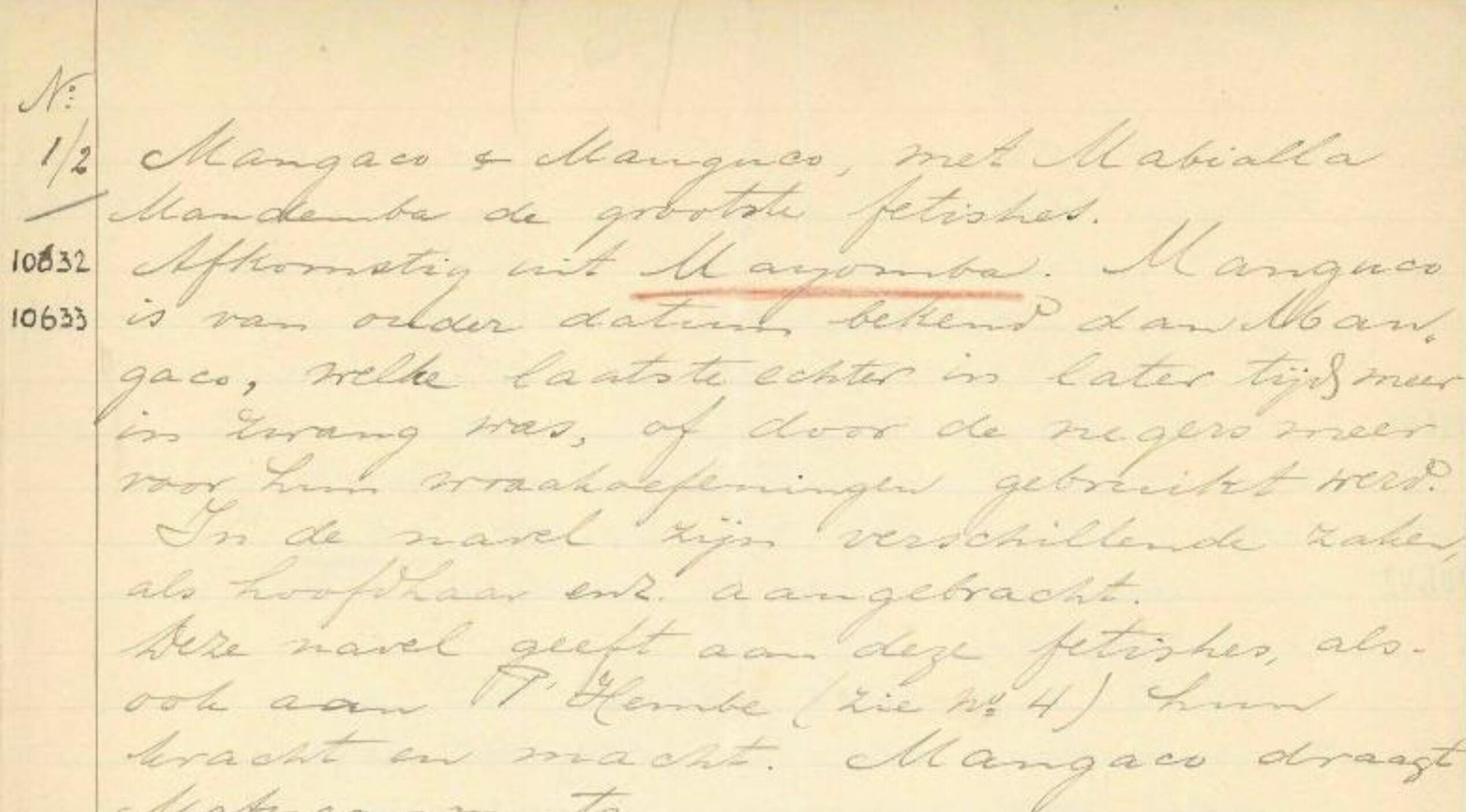 De nkisi stond in zijn catalogus vermeld als object nummer twee. Volgens Snel droeg het beeld de naam Manguco en was het afkomstig uit “Mayomba, Cabinda”. De Mayombe regio loopt deels door Cabinda, waar Snel van 1904 tot 1906 werkzaam was. Deze informatie zou tevens kunnen dienen als een indicatie dat de nkisi oorspronkelijk toebehoorde aan de Yombe bevolking, een gemeenschap binnen de Bakongo, die voornamelijk in deze regio woonachtig waren.