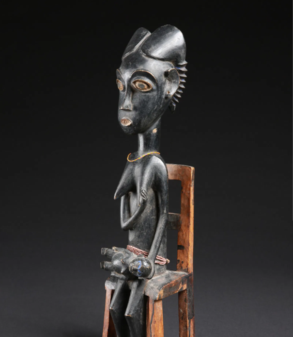 Dit zwart gekleurde beeld met rossige accenten (de ogen en de mond) en een naturel gehouden stoel, heeft het dunne, tere lichaam met een grote vrij hoofd, dat zo kenmerkend is bij de Asante.