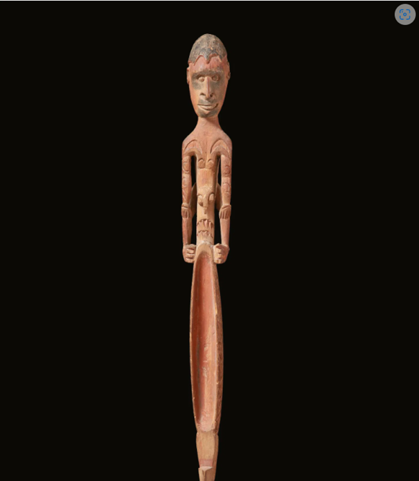n het boek van Tibor Bodrogi “Stammeskunst 1 Australien Ozeanien Afrika” las ik op pagina 116 over de houten schalen, waarin sago wordt opgediend of de rode en witte kleurstof wordt bereid of bewaard. Zij zijn of voorzien van een vaste mensenfiguur of stellen zelf een mensenfiguur voor. Tevens vinden we hier de van de beelden bekende langwerpige groeven en bruggen evenals tatoeage tekens.