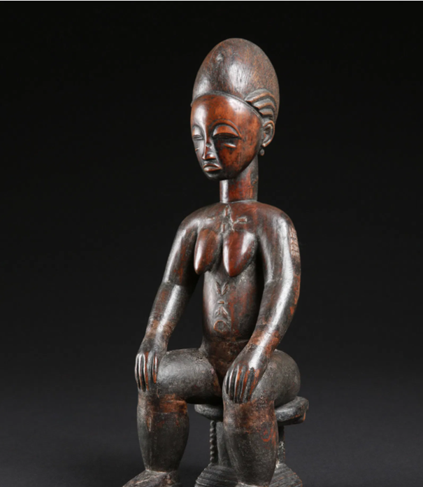 Object: een op een krukje zittende naakte Baule vrouw.
