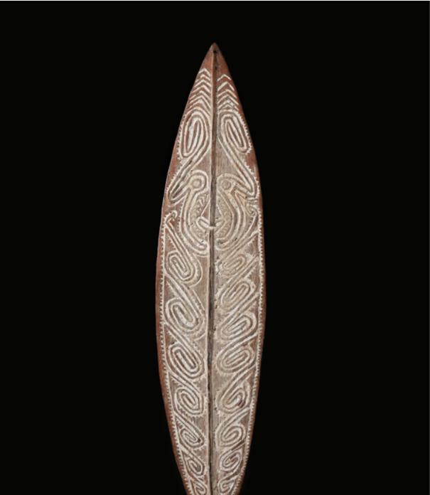 We zien hier een zgn. geesten bord , ‘Gope’ van de Elema uit De Golf provincie van Papoea Nieuw-Guinea. Het bord heeft min of meer in de vorm van een langwerpig vrij smal schild, is voorzien van een levendig patroon. Tegen de bruine achtergrond van het object zien we in het wit een vrij schematisch mensenhoofd afgebeeld, verdeeld over de twee helften van het object, en zich bevindend tussen het abstracte golfende witte patroon. Op deze wijze ziet dit object er zeer goed uit, maakt het een heel goede indruk.