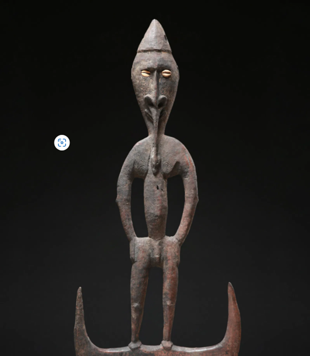 In het eerder genoemde boek van Ibor Bodrogi vond ik achterin als afbeelding 58 een dergelijke antropomorfe (mannelijke) ophanghaak uit het midden-Sepikgebied, in casu het dorp Kapokapi, die 110 cm groot was. Het gezicht van deze figuur bleek overigens wel sterk af te wijken van het gezicht van ‘onze’ haak: daar was geen sprake van de ‘slang die uit de neus verscheen, geen kaurischelpjes als ogen, maar waren opgeschilderde ogen, was gebruik gemaakt van witte kleurstof in het gelaat en tevens om bijv. de borsten en seksuele organen van de man te accentueren.