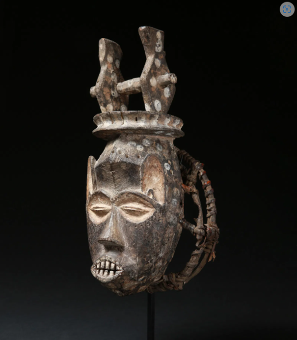 Het maskertje is vrij hoekig gesneden. Deze maskers behoren toe aan leden van het Bwami genootschap; zij hielden ze in hun hand, of werden aan een hut vastgemaakt of tegen een palissade gezamenlijk tentoongesteld.