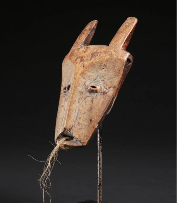 Beschrijving: Kennelijk is dit eenvoudige masker gesneden in de vorm van een dierenkop met hoorns. Aan de mond is een stukje vezelkoord bevestigd. Het gezicht was, zoals gebruikelijk, oorspronkelijk wit gemaakt met kaolien, waarvan u nog vaag enige resten kunt zien.