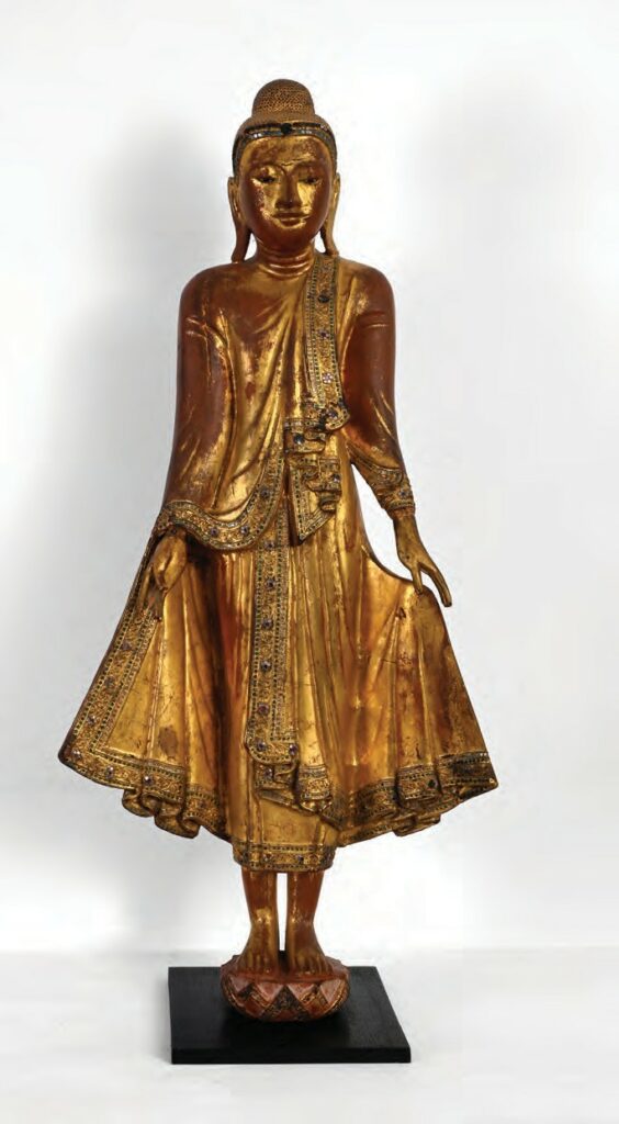 Hugo en Loes kochten bij Galerie De Ruimte een negentiende-eeuwse Mandalay Boeddha Sakyamuni uit Birma. Een Mandalay boeddha heeft meestal een jeugdige, vriendelijke uitstraling. Het met bladgoud bedekte beeld draagt een lang koninklijke gewaad, uttarasanga, fraai geplooid en aan de randen gedecoreerd.