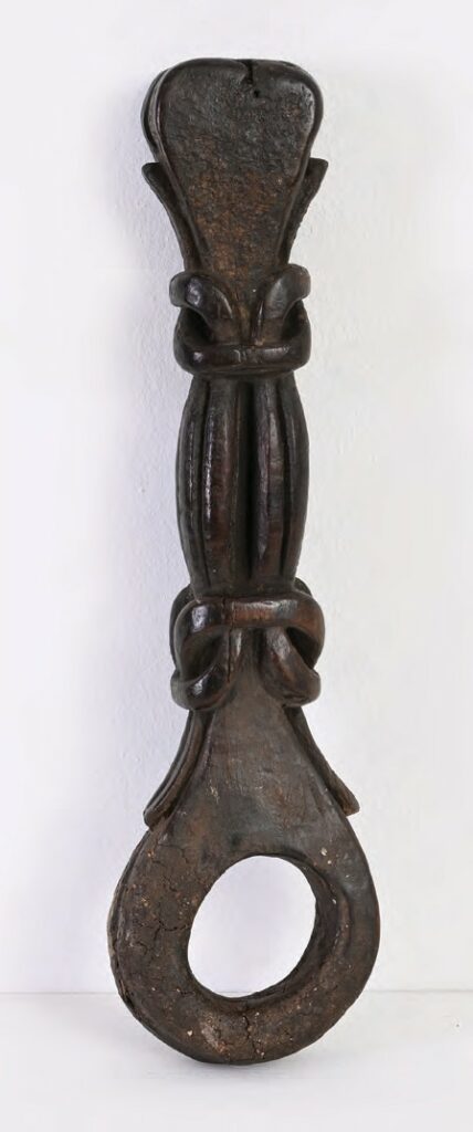 Hugo en Loes bezoeken jaarlijks de etnograficabeurzen in Brussel en Parijs. Op de Tribal Art Fair in De Duif aan de Prinsengracht in Amsterdam, kochten ze bij Karavanserai uit Maastricht een Nepalese ghurra, een houten karnstokhouder die gebruikt wordt bij het karnen van melk om boter te verkrijgen. Het verticale deel symboliseert de lingam, het mannelijk geslachtsorgaan, de ronde opening vertegenwoordigt de zonneschijf, de chakra. De chakra verwijst zowel naar Vishnu, god van overvloed, schoonheid en geluk als naar de yoni, het vrouwelijk geslachtsorgaan, symbool van de oorsprong der schepping. Uit deze twee-eenheid ontstaat elke levensvorm.